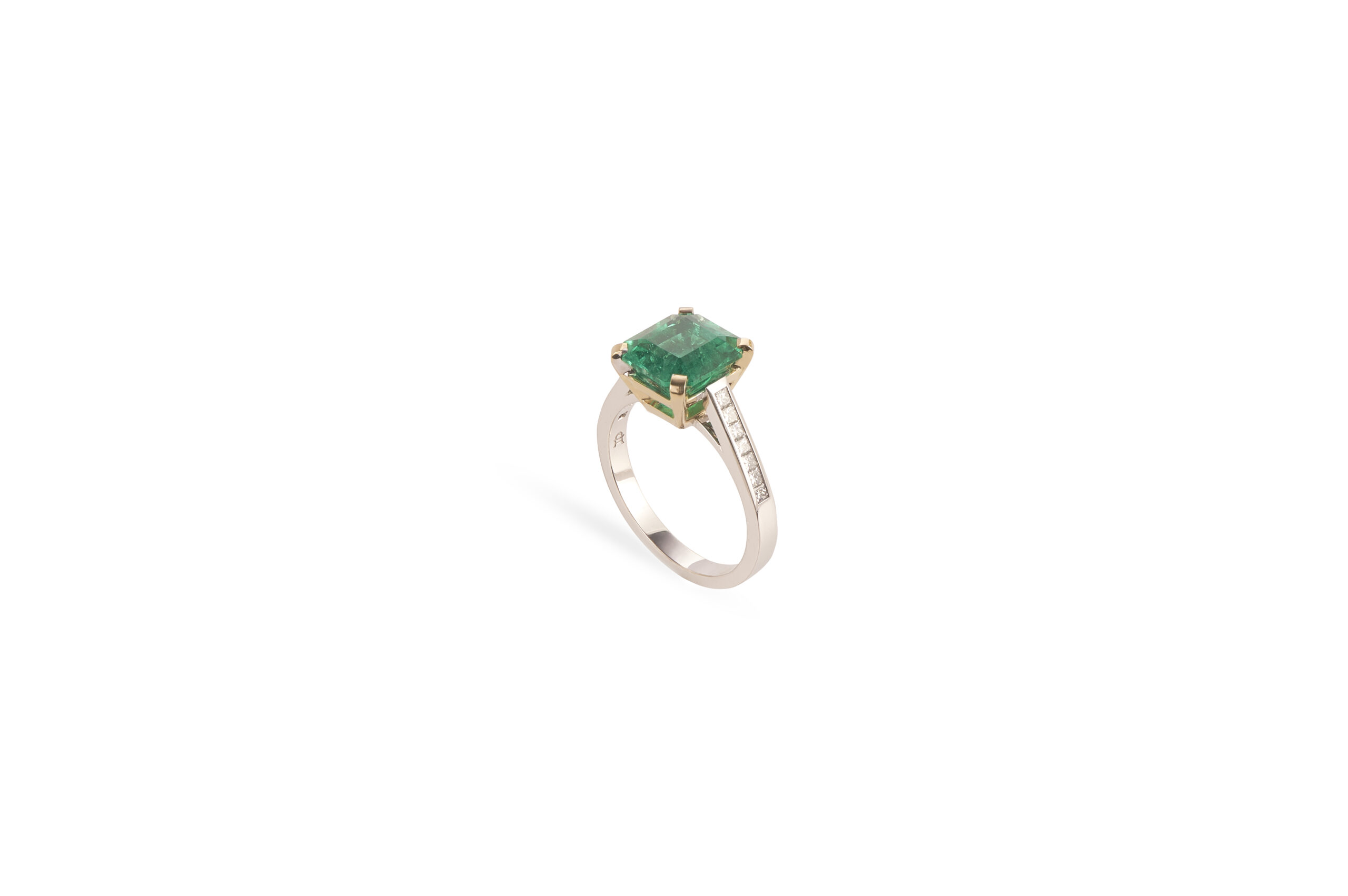 Atelier Heldwein Emerald “Princess” ring with diamonds 1 emerald 3.07ct faceted Colombia 14 diamonds princess cut 0.31ct F/vvs 4.6gr. Yellow + White Gold 750/000